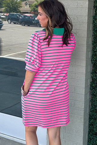 Rose Stripe Collared V Neck Puff Sleeve Shift T Shirt Dress with Pockets