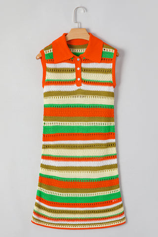 Yellow Stripe Eyelet Sleeveless Buttoned Split Neck Sweater Dress