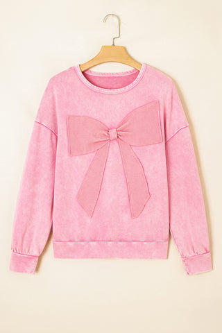 Bright Pink Mineral Wash Big Bow Patchwork Pullover Sweatshirt