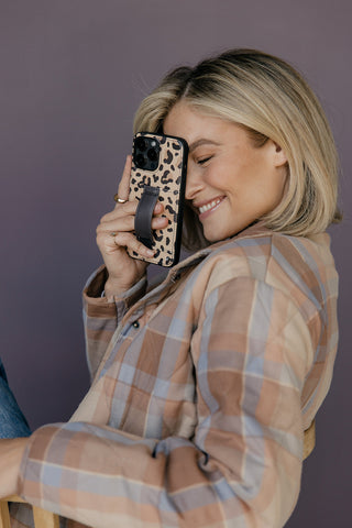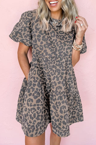 Brown Denim Leopard Printed Short Puff Sleeve Mini Dress