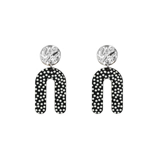 Silver And Black Arch Disc Dotted Hammered Polka Dot Stud Featherweight Hypoallergenic Nickel Free Drop Earrings. Custom Lucite Acrylic Geometric Shapes Accents And Designed With Love In Texas. Size 1.75 Inches Long x .75 Inches Wide With Custom Sizing Available On Select Pieces.